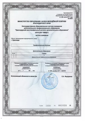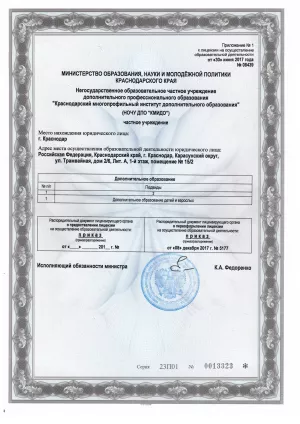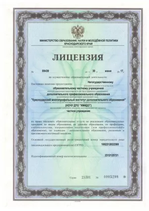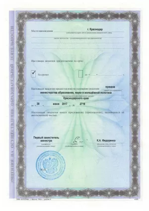 Образовательная деятельность ведется на основании Лицензии № 08439 от 30.06.2017 г., серия 23Л01 №0005298, выданной Министерством образования, науки и молодежной политики Краснодарского края на срок бессрочно.
